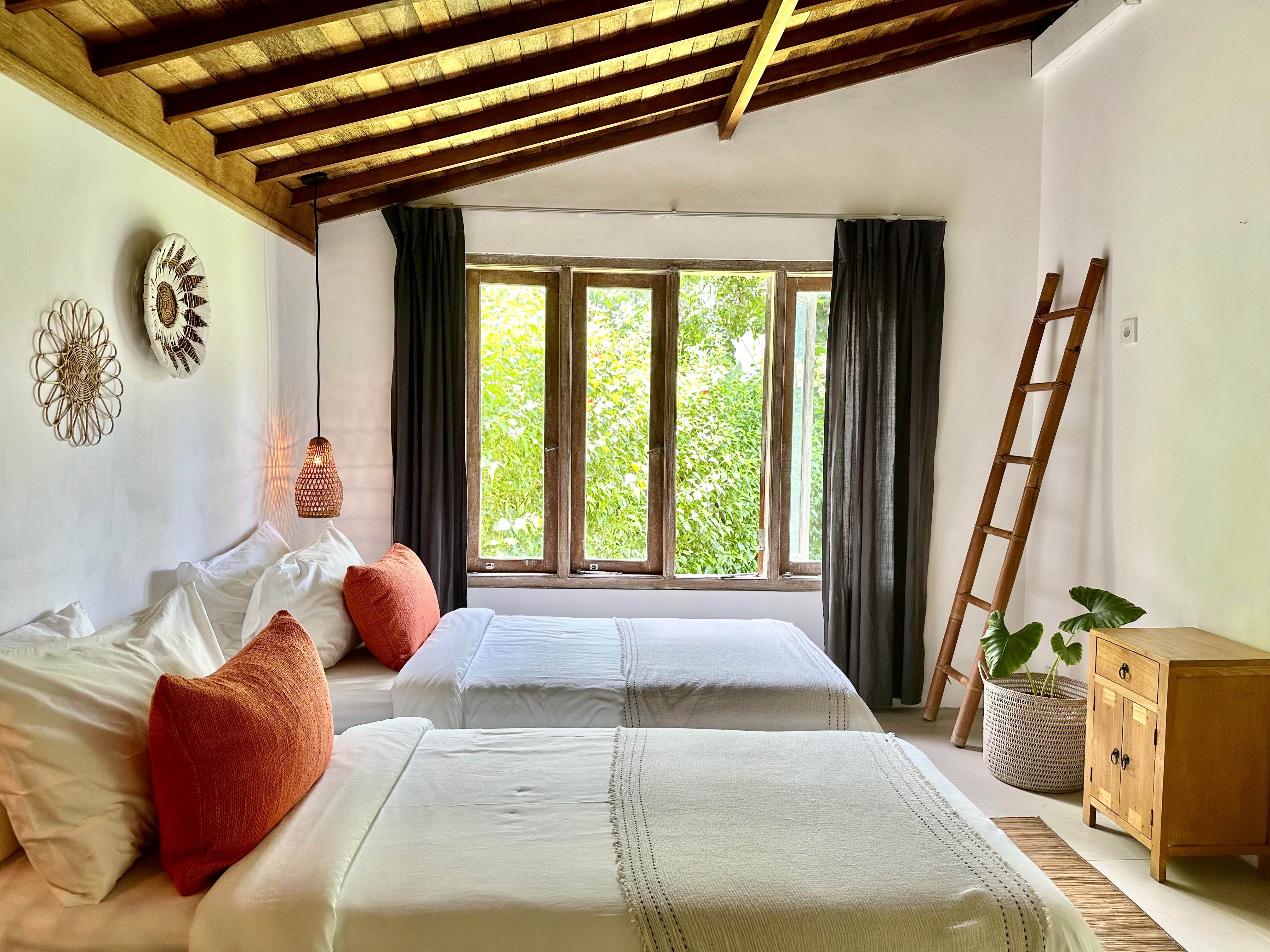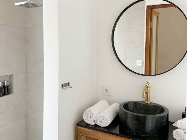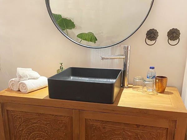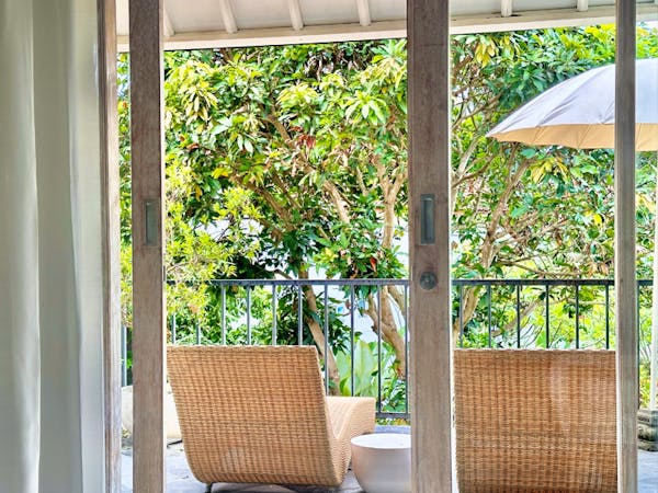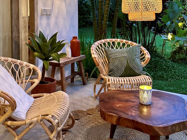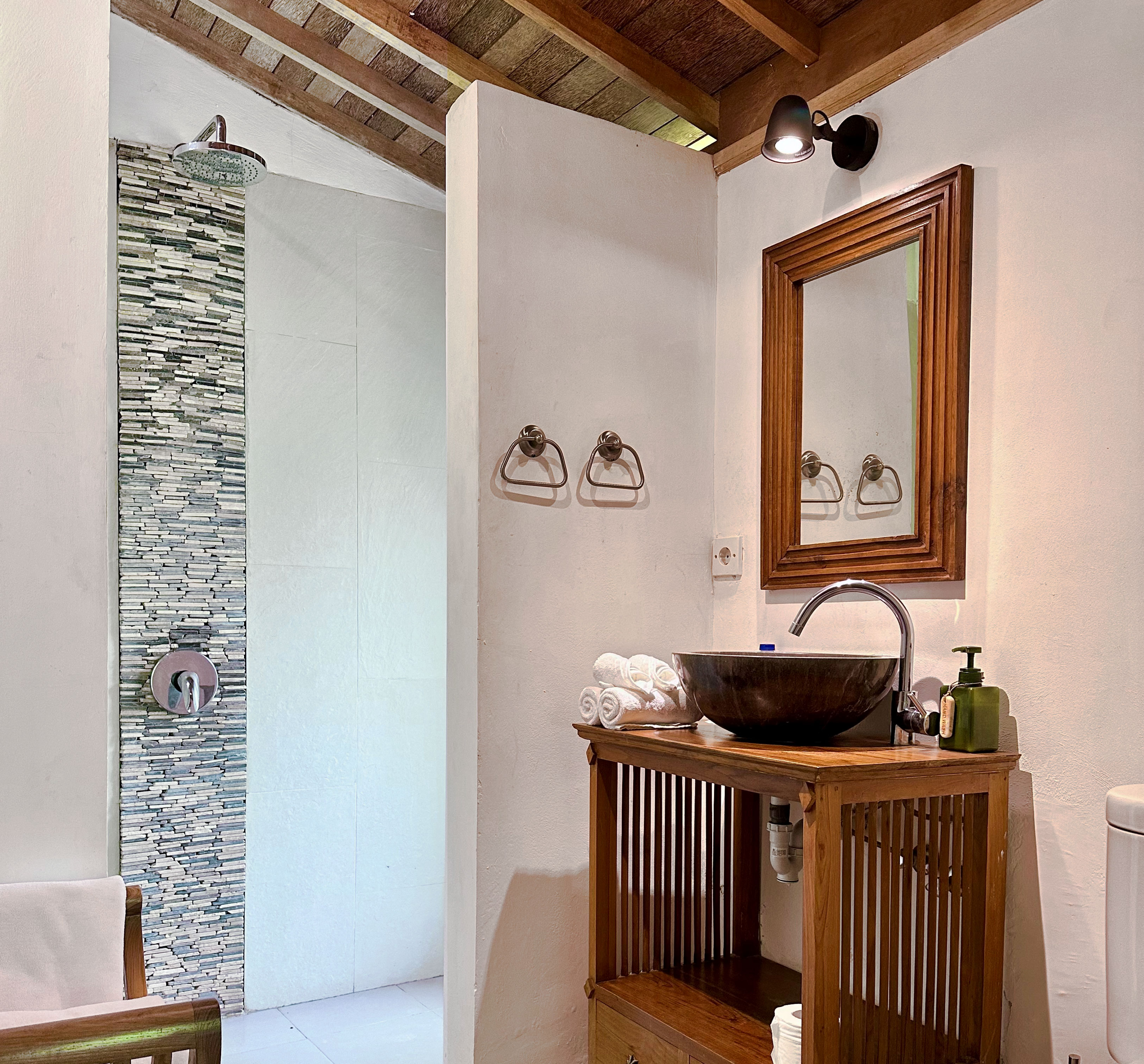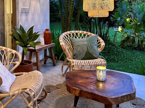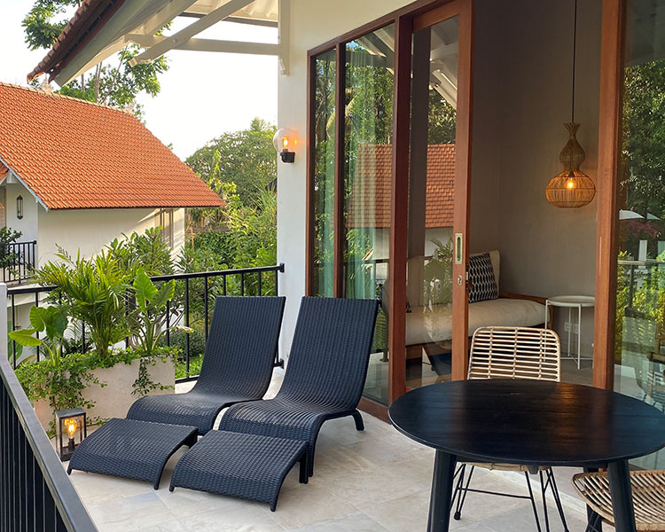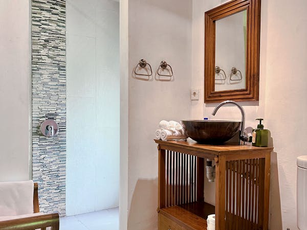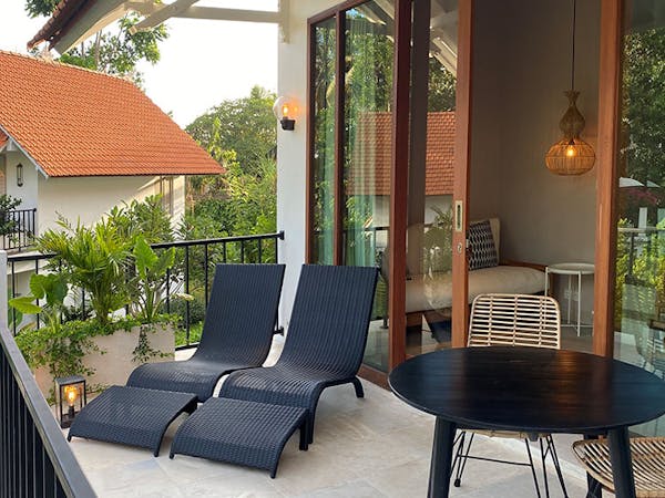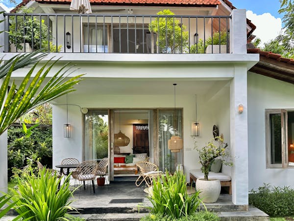 Villa in two floors. Upstairs bedroom with ensuite bathroom with copper bathtub and separate shower. Large balcony. Downstaris living area, kitchen, the second bedroom with bathroom, and terrace plus garden.This villa is the one closest to the pool, with a nice view. Suitable for a family of four or 2 friends / couples sharing a villa.