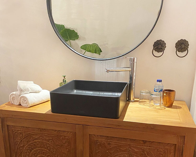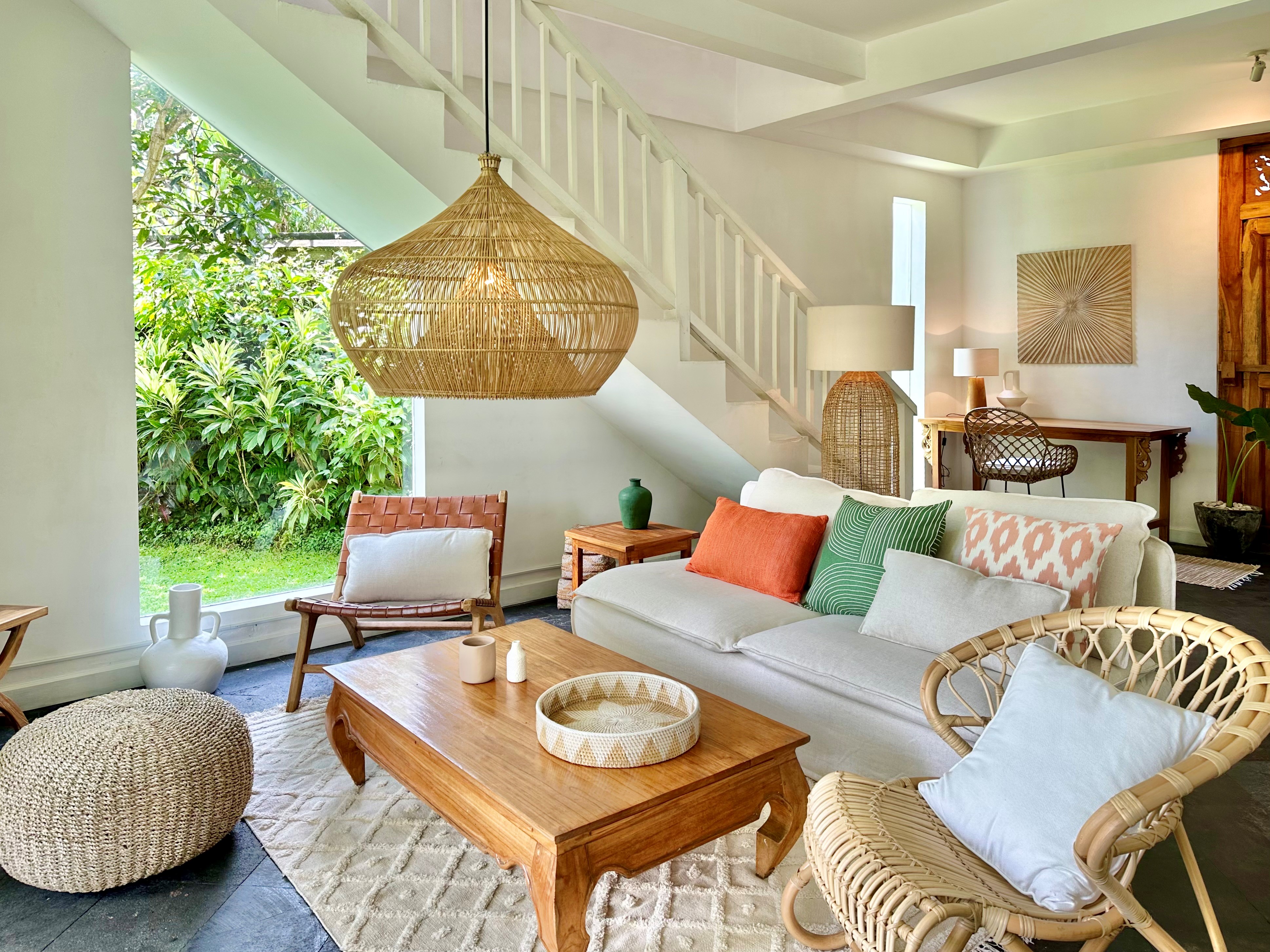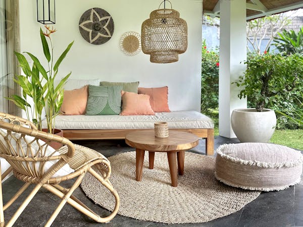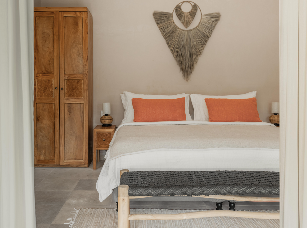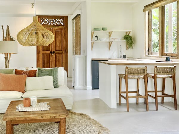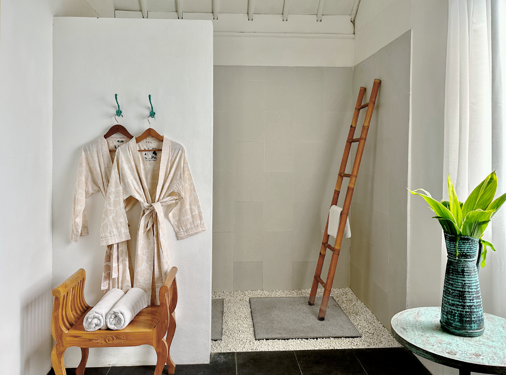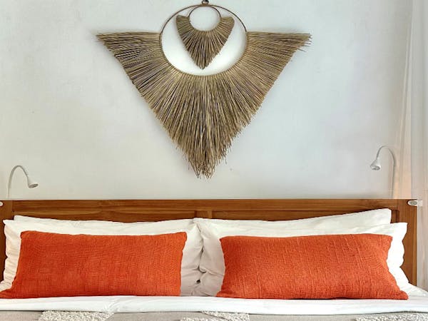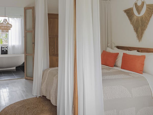 Villa in two floors. Upstairs bedroom with ensuite bathroom with copper bathtub and separate shower. Large balcony. Downstaris living area, kitchen, the second bedroom with bathroom, and terrace plus garden.This villa is the one closest to the pool, with a nice view. Suitable for a family of four or 2 friends / couples sharing a villa.