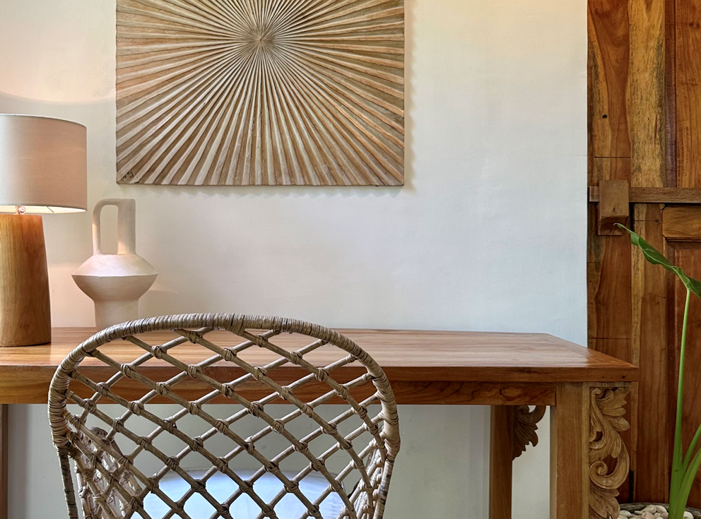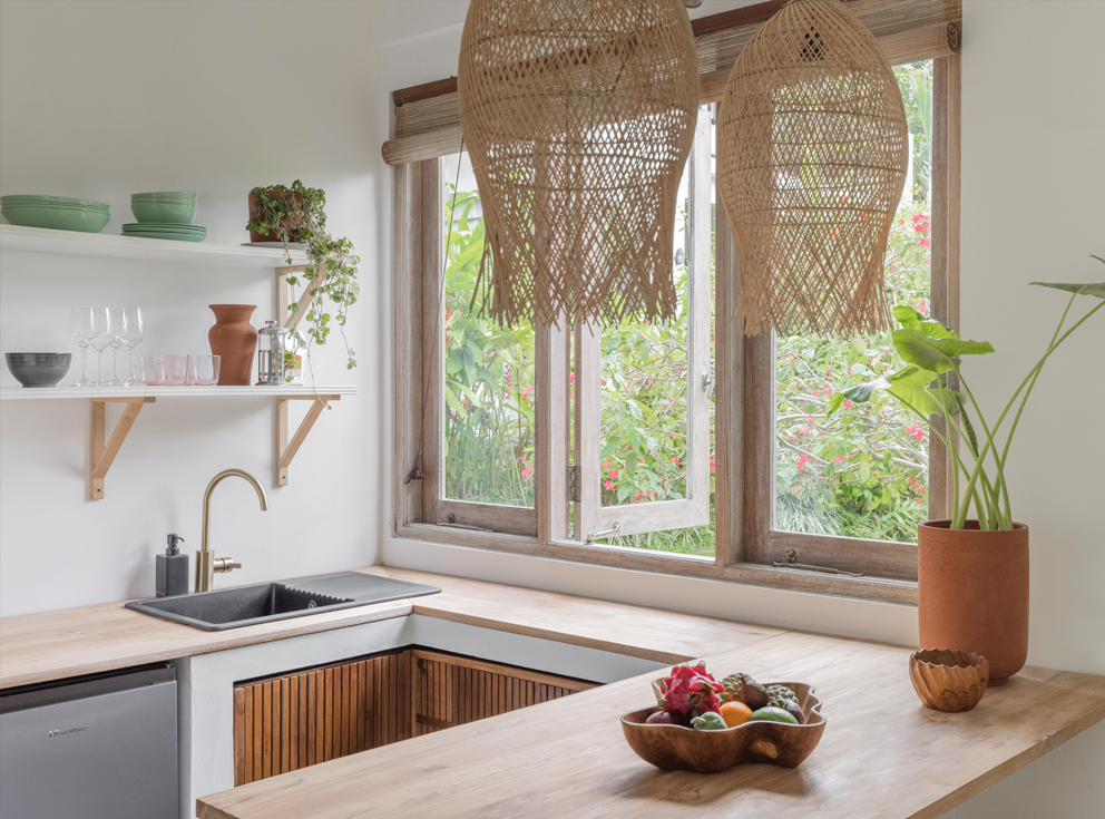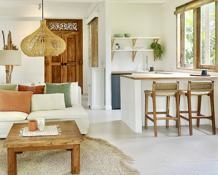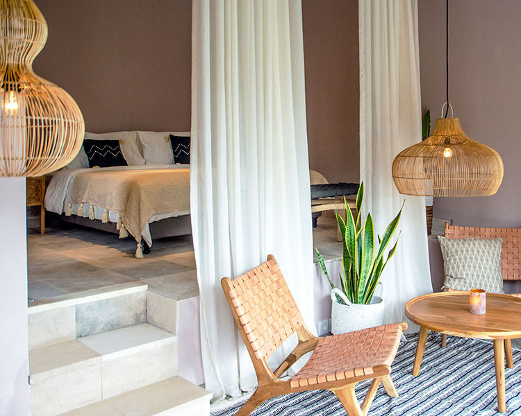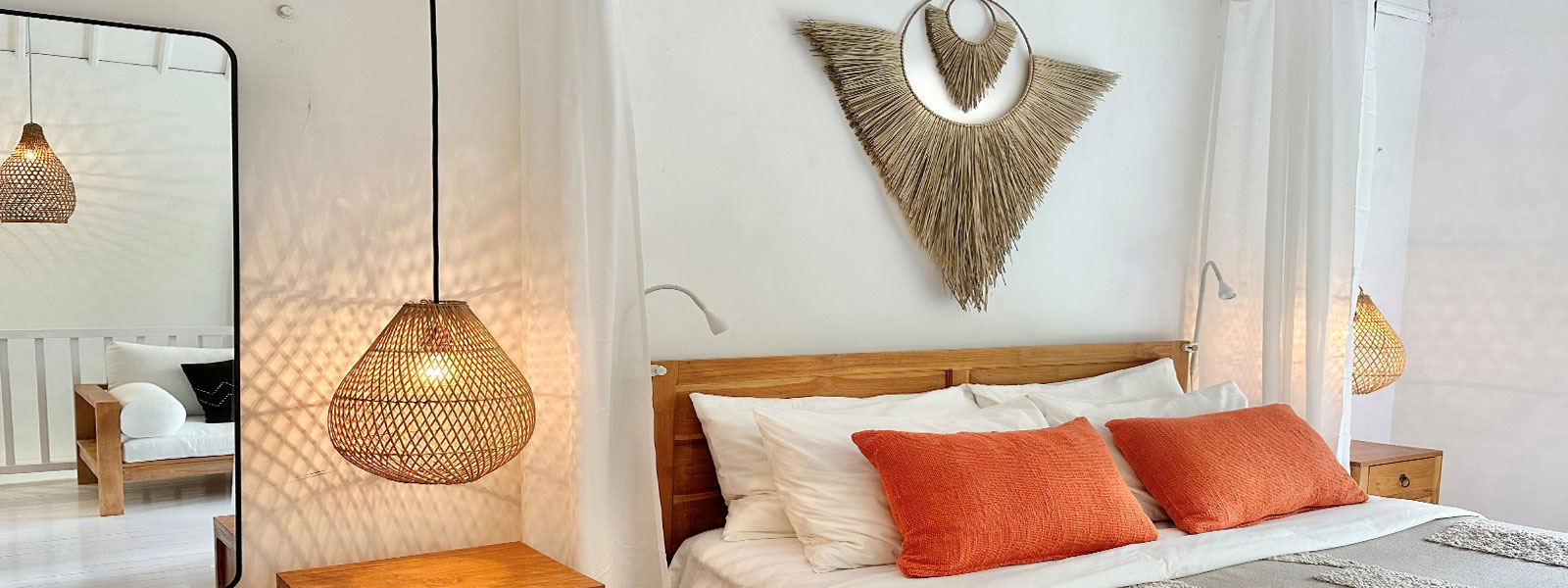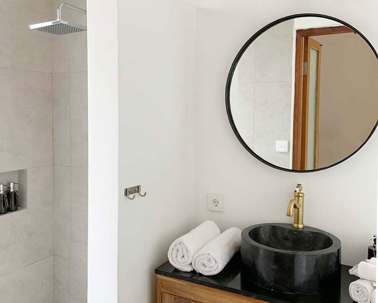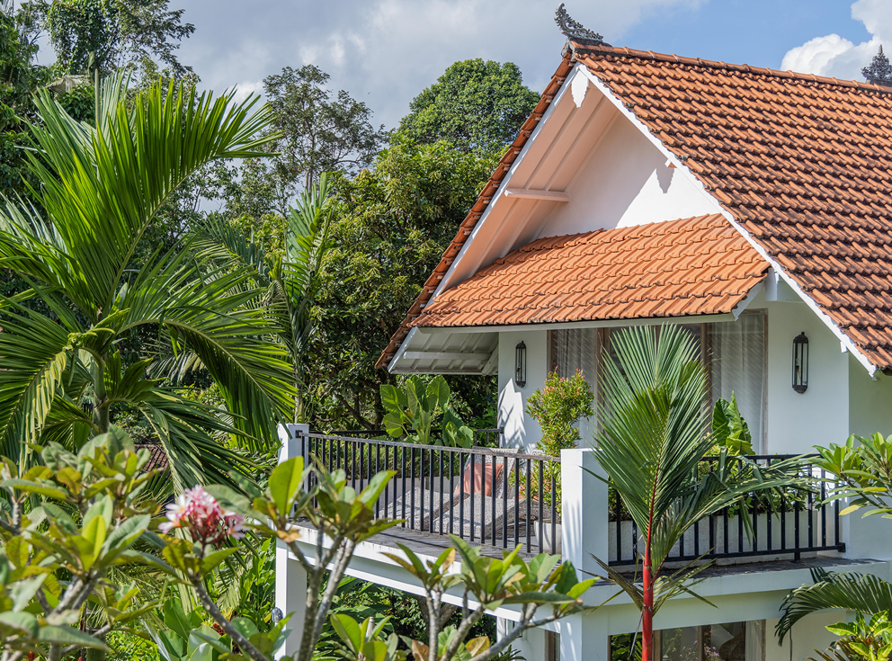 Villa in two floors. Upstairs bedroom with ensuite bathroom with copper bathtub and separate shower. Large balcony. Downstaris living area, kitchen, the second bedroom with bathroom, and terrace plus garden.This villa is the one closest to the pool, with a nice view. Suitable for a family of four or 2 friends / couples sharing a villa.
