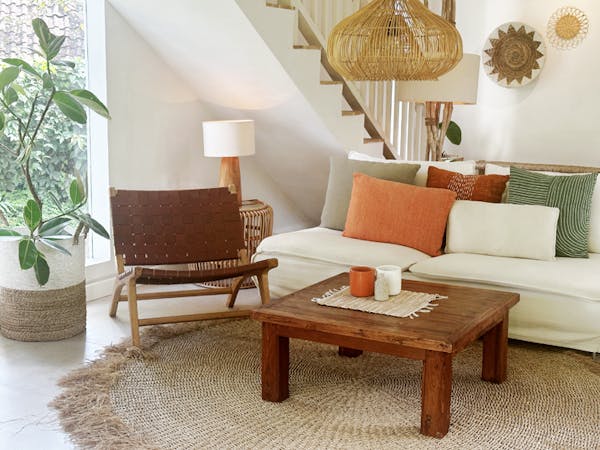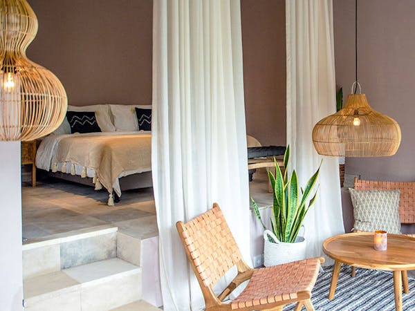 This is our suite with bedroom with kingsize bed plus lounge area with sofa, lounge chair, table and view to terrace. Terrace with table and chairs, and two lounge chairs. Bathroom with shower. There is TV, mini fridge with mini bar and kettle for tea/coffee. In the suites we welcome adults and children age 12+. Max 2 people in each suite.