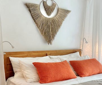 This is a spacious villa in two floors. Upstairs is the bedroom with ensuite bathroom with shower. Large balcony. Downstaris living area, kitchen, toilet room and terrace plus garden. Suitable for 2 adults and up to one child and one infant. Enjoy!